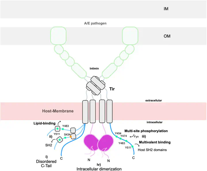 Image by Vieira et al. on BioRxivThe translocated intimin receptor (Tir) is a central effector of Attaching and Effacing (A/E) pathogens responsible for worldwide foodborne disease cases. Tir acts as a cell-surface receptor in host cells, rewiring intracellular processes to assist infection by targeting multiple host proteins. We sought to understand the basis for Tir binding diversity in signaling. Here, we establish that Tir is a disordered protein with host-like binding motifs. A trait we find prevalent in several other effectors secreted by A/E bacteria. We disclose that Tir has a disordered C-terminal intracellular tail (C-Tir) with non-random structural preferences at phosphorylation sites, including host-like tyrosine-based motifs, with versatile lipid- and SH2 domain binding capability pre-phosphorylation. We show that multi-site tyrosine phosphorylation enables C-Tir to engage SH2 domains in a multivalent manner, consistent with Tir’s scaffold/hub role for host proteins. Last, we uncover Tir’s ability to dimerizes via its partially disordered N-terminal intracellular domain. Collectively, our findings provide an updated picture of Tir’s intracellular side, highlighting its ability to mimic host disordered membrane receptors’ versatility as a molecular strategy for host evasion.